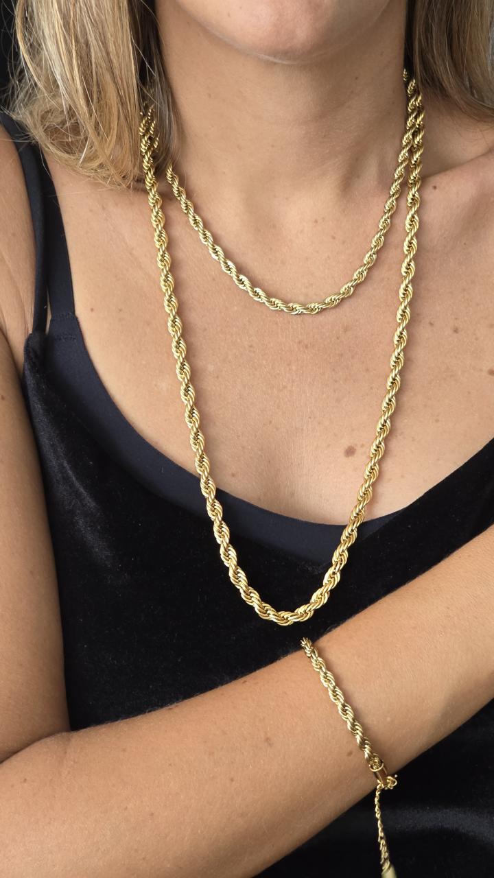 Cadena lazo estilo cordón de oro laminado de 18k, diseñada para lucir elegante y versátil. Disponible en dos largos diferentes, esta pieza puede combinarse fácilmente entre sí o complementarse con la pulsera del mismo set, creando un conjunto perfecto para cualquier ocasión. Su acabado en oro le confiere un brillo sutil y sofisticado, ideal para añadir un toque de lujo a tu estilo diario