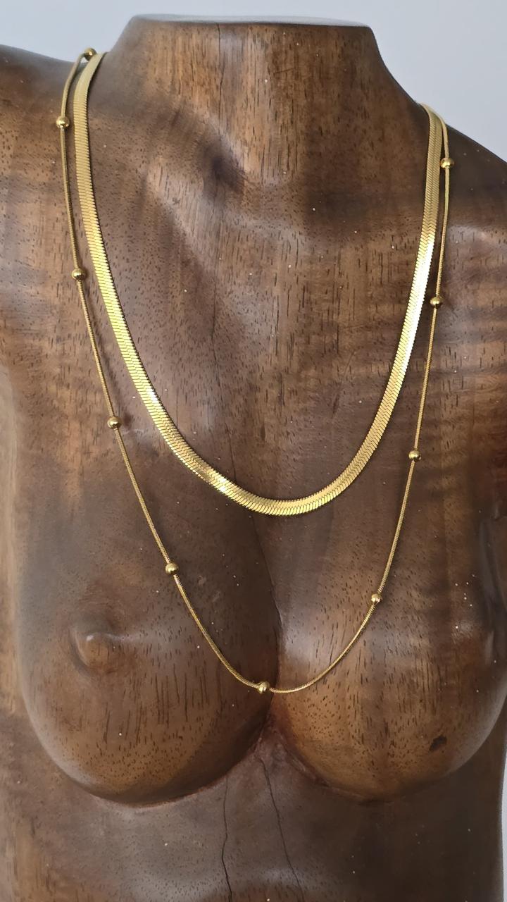 Dúo egipcio compuesto por dos delicadas cadenas de Oro laminado de 18k. Una de las cadenas es plana, aportando un toque minimalista y elegante, mientras que la segunda, ligeramente más larga, cuenta con pequeñas bolitas espaciadas que añaden un detalle sutil y refinado. Este conjunto versátil es perfecto para usar en capas, logrando un estilo sofisticado y atemporal inspirado en la elegancia del antiguo Egipto.