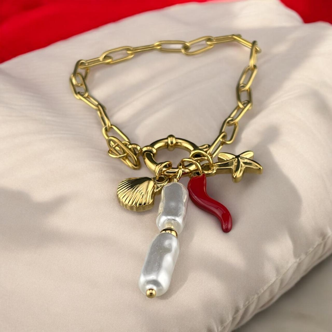Esta pulsera en oro laminado de 18k es una pieza vibrante y única. Su cadena de eslabones grandes es moderna y elegante, ideal para cualquier ocasión. Lo que realmente destaca en esta pulsera son los detalles colgantes: una concha marina dorada, una estrella de mar, un coral rojo que aporta un contraste atrevido, y perlas alargadas que le dan un toque sofisticado. Es una joya inspirada en el mar, con un estilo contemporáneo que resalta por su originalidad y colorido.