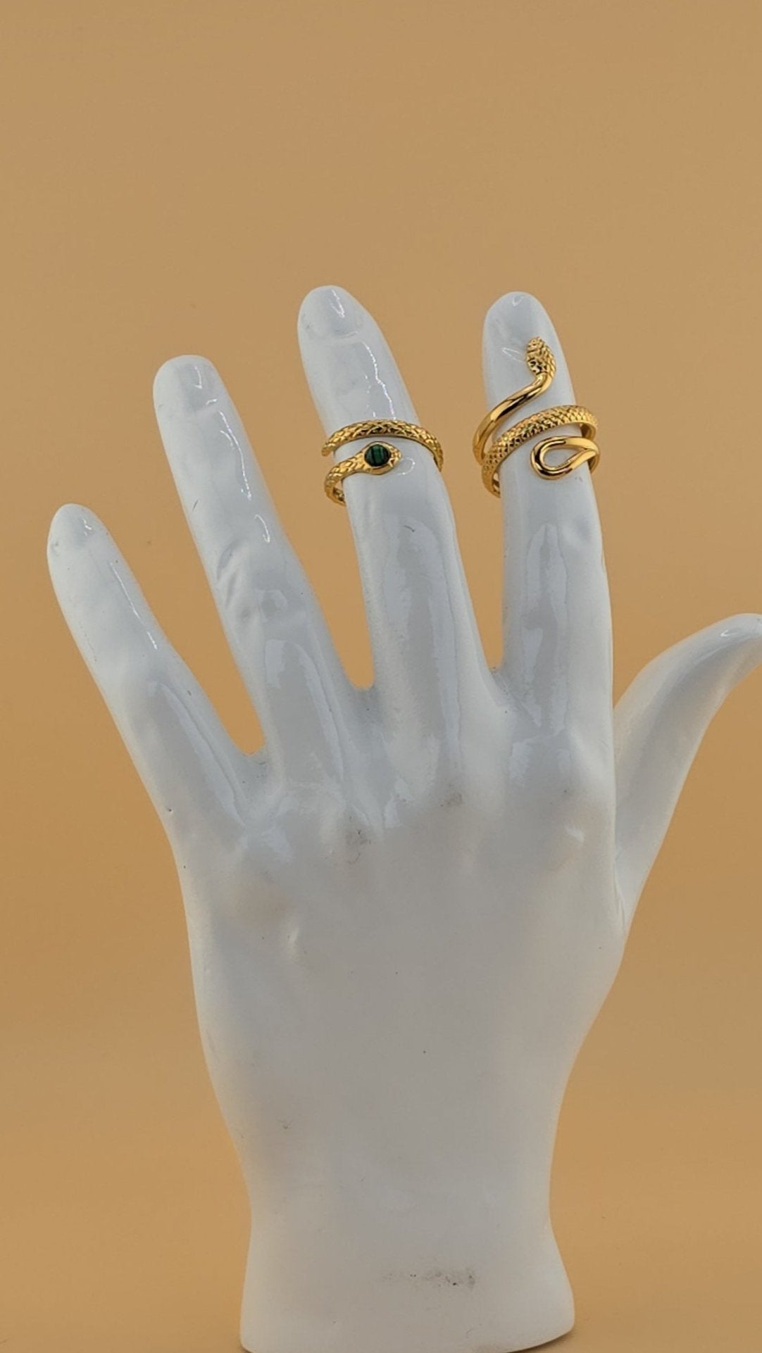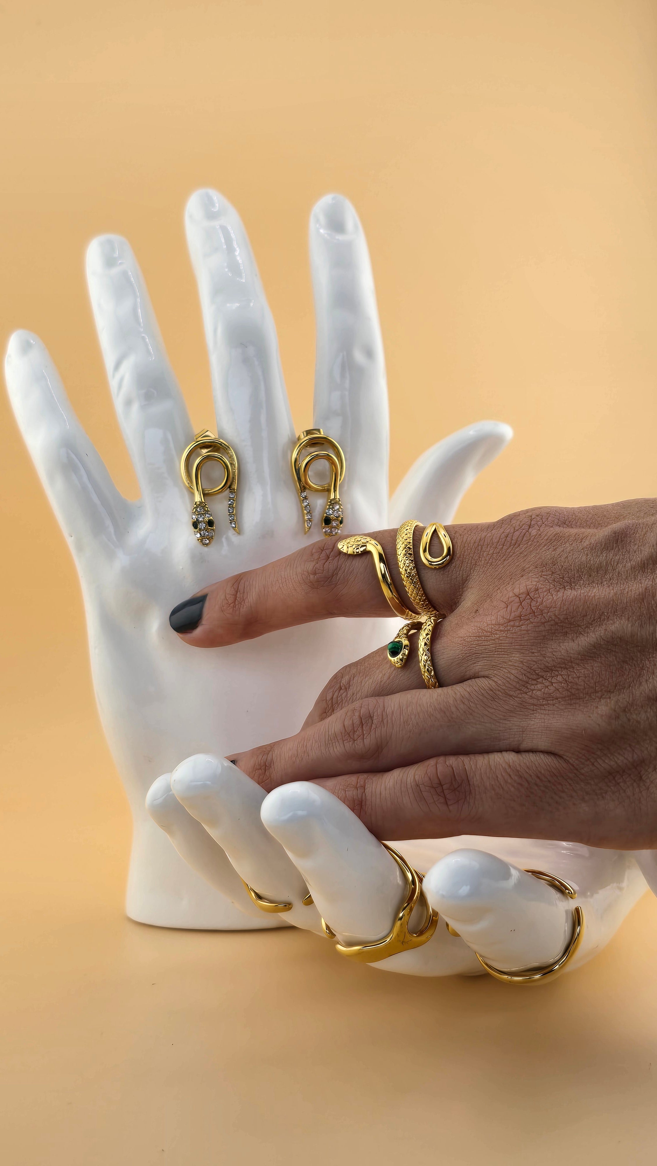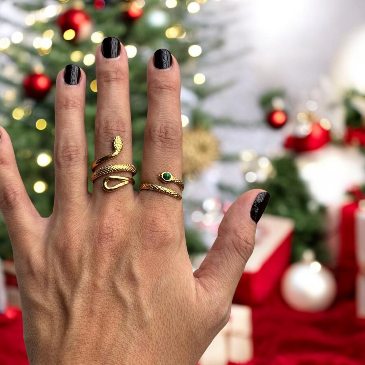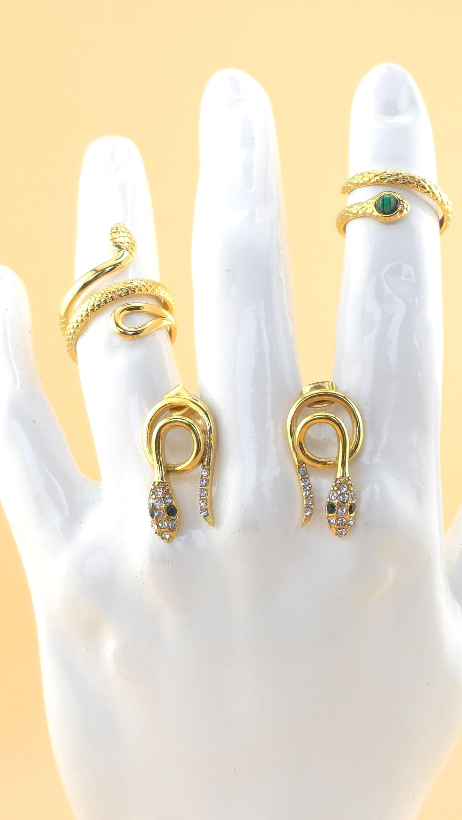 Este impresionante set de aretes y anillos de serpientes en oro laminado de 18k combina lujo y detalle. Con cuerpos enroscados y brillantes cristales, estas piezas capturan la esencia mística y elegante de la serpiente